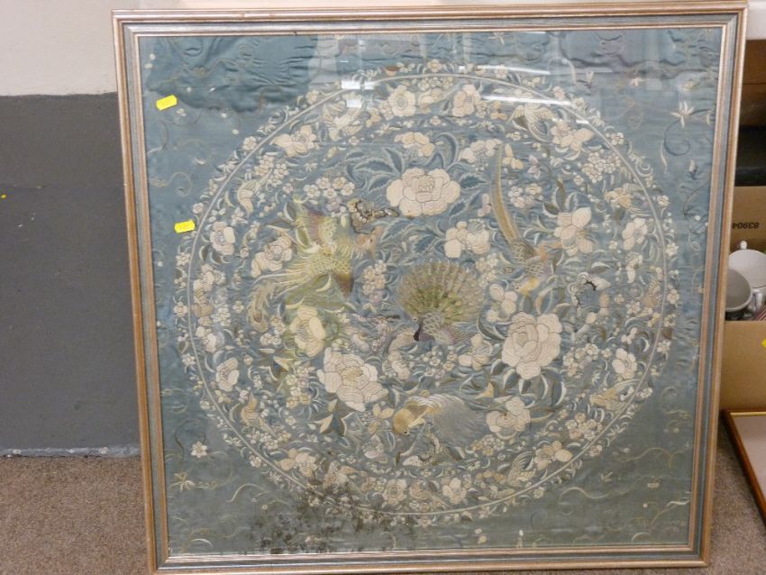Large framed tapestry depicting peacocks and flowers, 71 x 71 cms