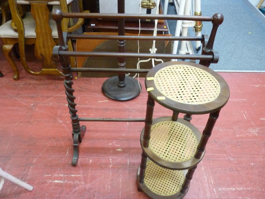 Dark wood towel airer and a circular cane three shelf whatnot