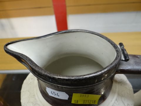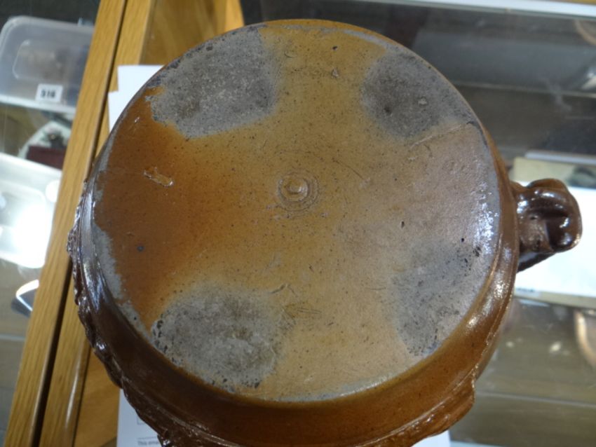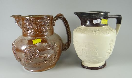 A nineteenth century stoneware tavern jug relief decorated with ensign, mask head spout, unmarked together with a Parian jug with hunting scene Condition Report: please request* *Condition is not stated in this type of auction with description and must be obtained by email prior to bidding as items are otherwise are purchased 'as seen'The brown jug is 22cms high, there are nibbles around the spout otherwise all good.The white jug is 21cms high, it is missing its lid, otherwise all good.Neither jug has any markings