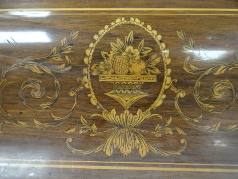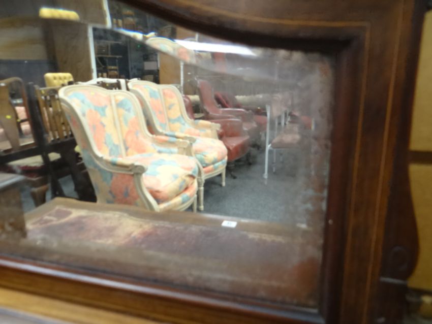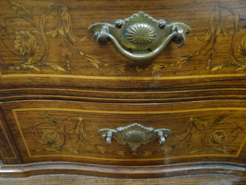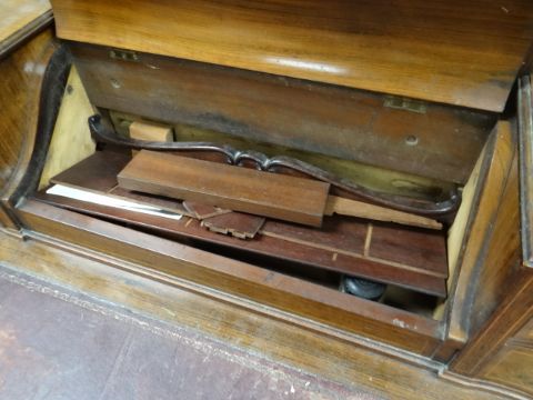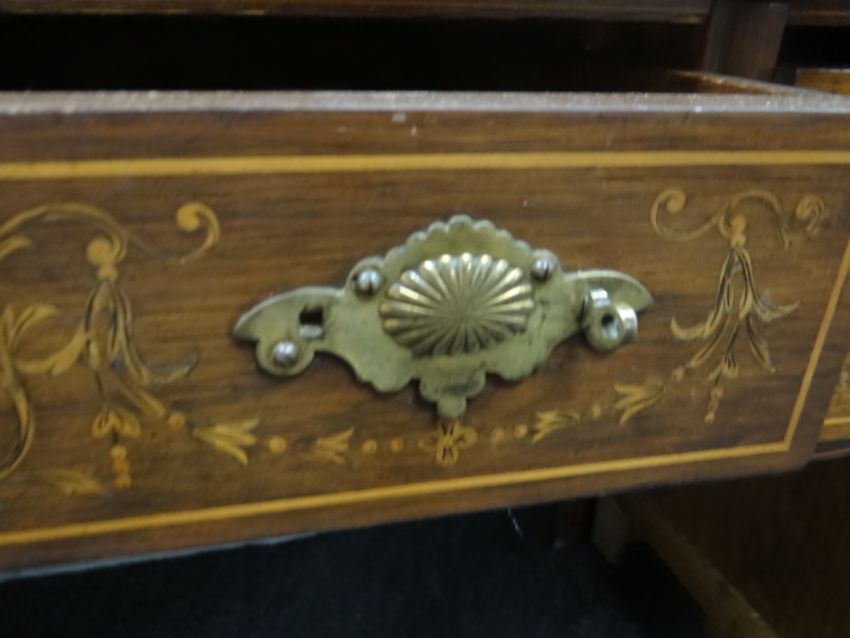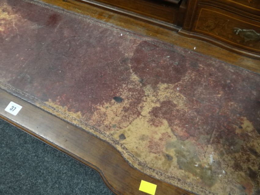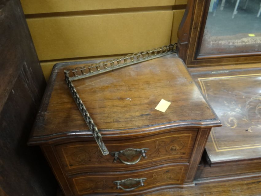 An antique rosewood writing desk by Maple & Co with marquetry serpentine covered stationary cabinet, four drawers & mirror back to the top & three drawers to the base (for restoration)