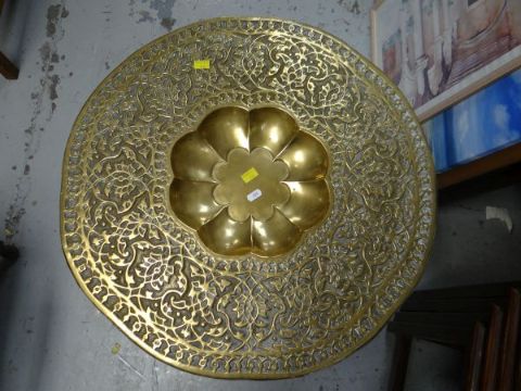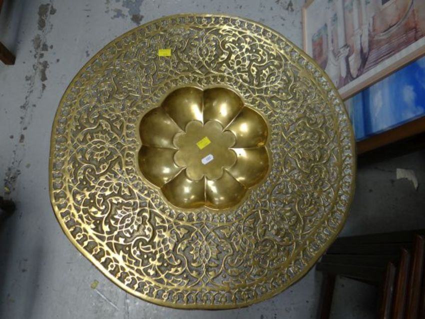 Three old golf clubs, a silver mounted walking stick, hat box & Islamic brass top table