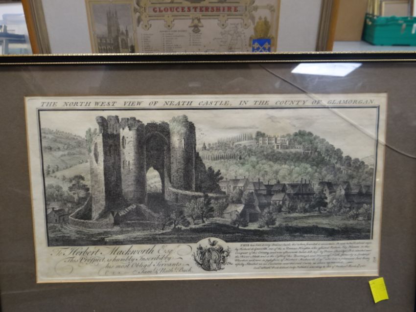 A framed SAMUEL & NATHANIEL BUCK print of Llanblythian Castle & sundry antique maps ETC