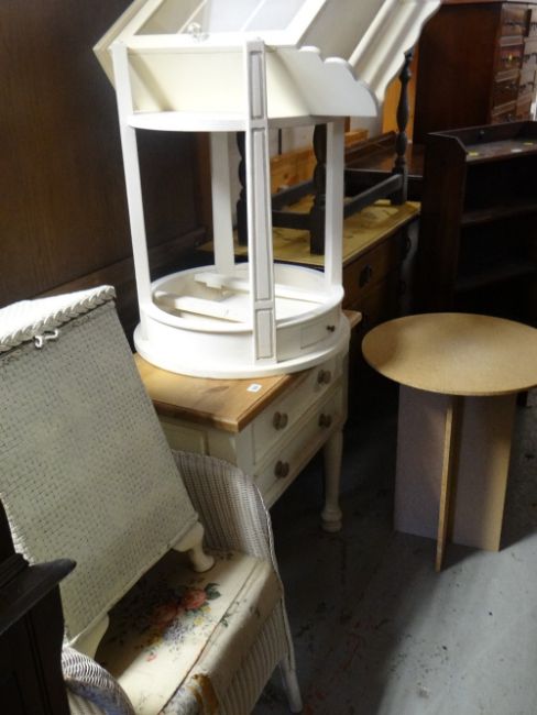 A small pine top two drawer table, a loom basket & chair, two items of modern white painted furniture ETC