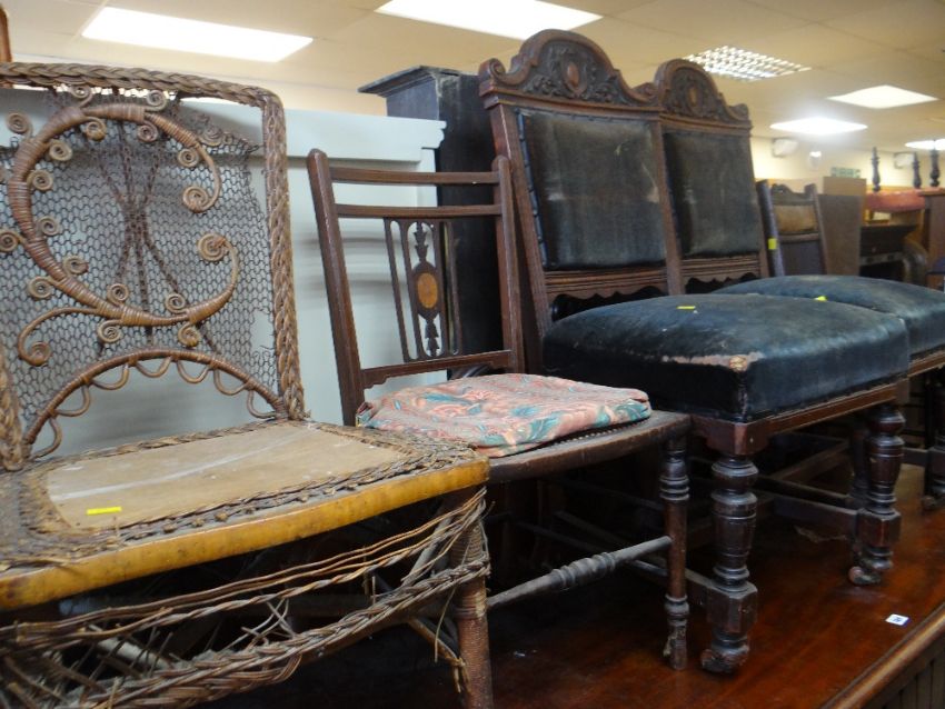 A vintage banded cabin trunk, a metal box & a small vintage suitcase together with five vintage chairs (distressed)