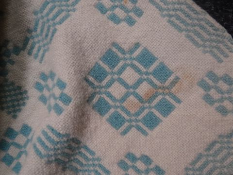 A turquoise ground geometric Welsh blanket & another Condition Report: please request* *Condition is not stated in this type of auction with description and must be obtained by email prior to bidding as items are otherwise are purchased 'as seen'condition:there is some staining on both blankets