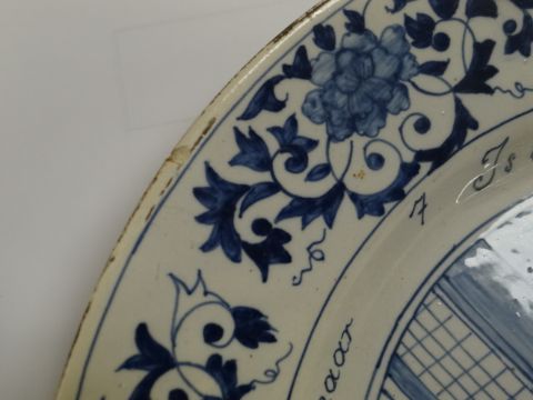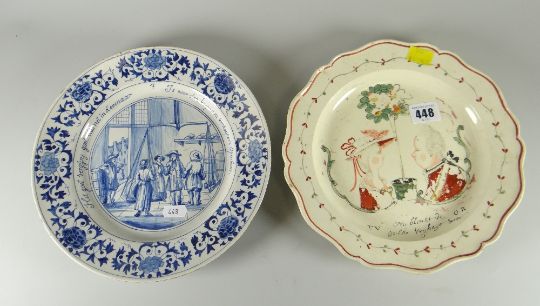 An interesting late eighteenth / early nineteenth century creamware dish with satirical illustration & inscription in German together with an antique Delft plate with Dutch inscription & figures