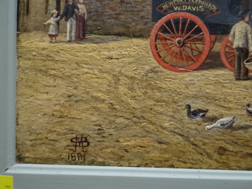 A primitive-school oil painting of a South Wales 'Commercial' public-house, with figures outside & a horse drawn carriage named 'The Shah', operated by W Davis of Newport & Crymmych, the painting monogrammed, possibly with SMB & dated 1881, 31 x 47cms