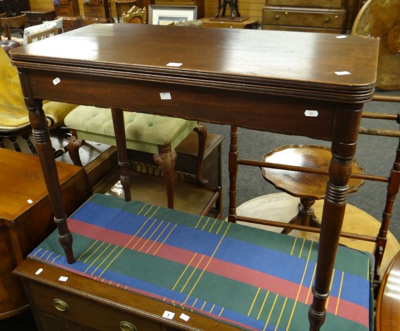 An antique foldover tea table on turned legs (A/F), 91wx45dx75hcms.