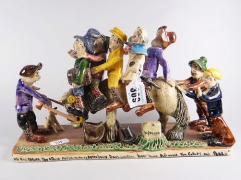 A Widdecombe pottery model of many jolly figures, inscribed with Bill Bruer, Ian Stewer, Peter Quamby, Peter Davey, Daniel Whitton, 'Arry 'Awke, Old Uncle Tom Cobley