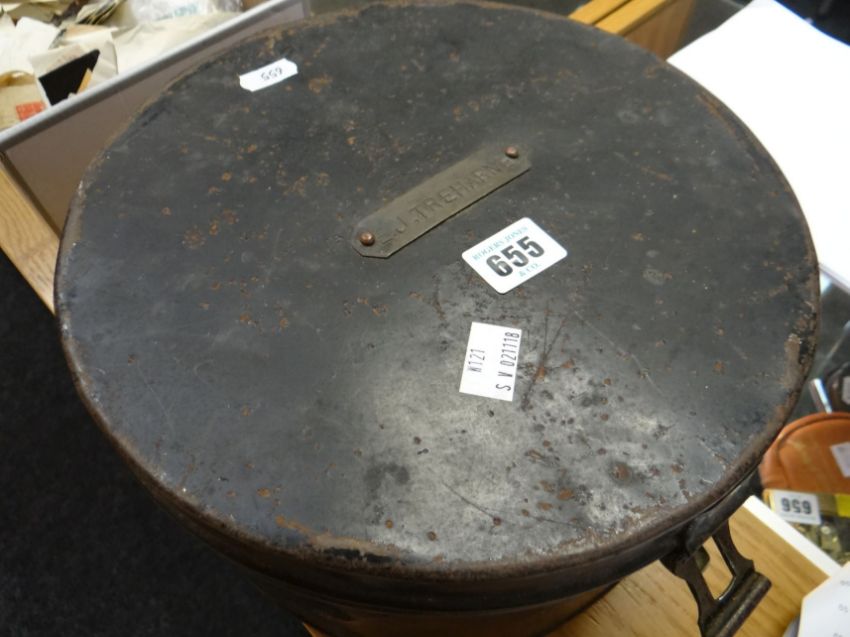 A vintage tin hat box with name plate for J Treharne containing a mass of old coinage