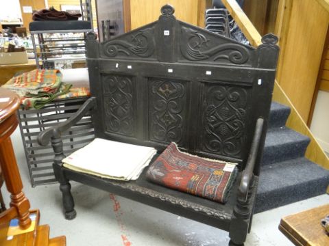 An antique ebonized carved settle with three-panel back, 120wx59dx137h cms