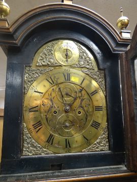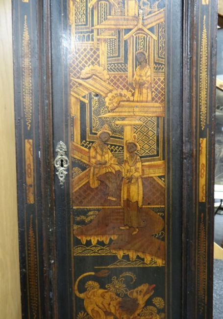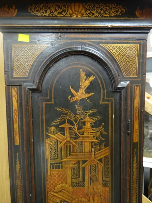 Thomas Marsh of London 8-day chinoiserie decorated longcase clock, the brass face with Roman numeral chapter ring, subsidiary dials & corner spandrels with dolphin decoration with an arch topped hood with bird pediment. The longcase body profusely decorated with Chinese motifs & designs, raised on platform base
