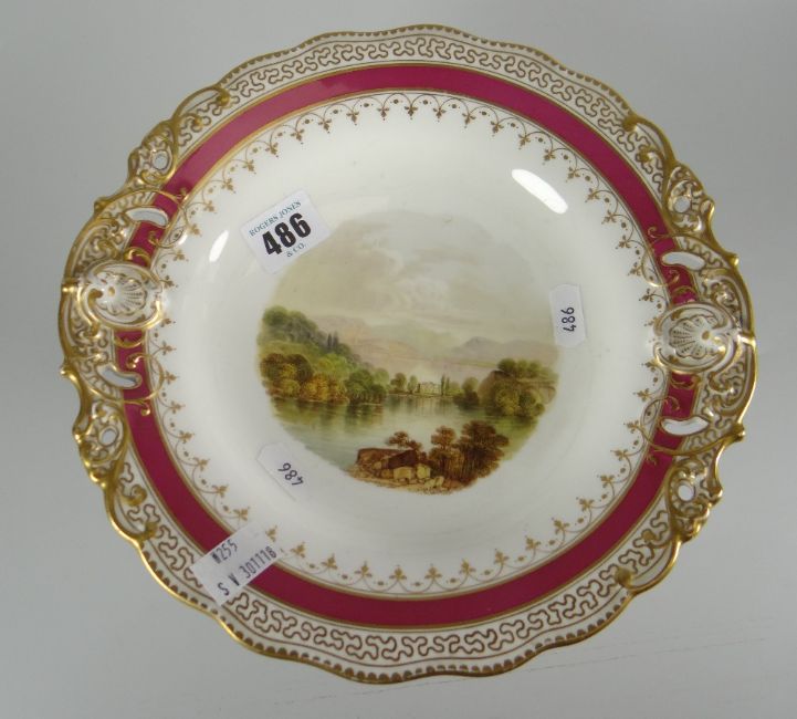 A Staffordshire porcelain cake stand with landscape scene titled to the base 'Loch Arkeg'