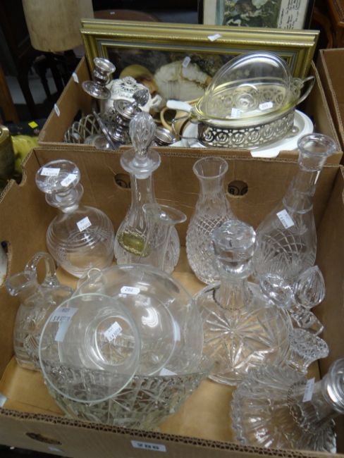 A box of glass decanters & a box of mixed pottery, EPNS, prints ETC