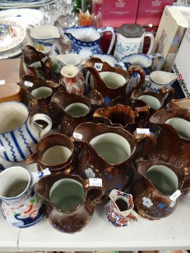A large collection of antique pottery jugs including copper lustre
