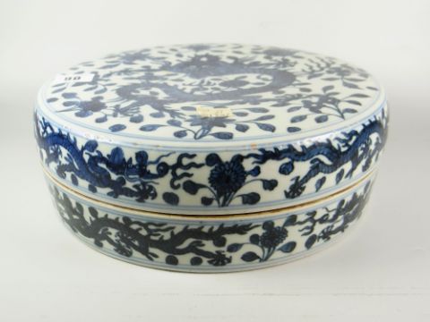 CHINESE PORCELAIN BLUE & WHITE DRAGON DECORATED CYLINDRICAL BOX & COVER depicting five clawed dragon & flaming pearl within flowers & foliage, six blue character marked to base within double concentric circles, 28cms diam.