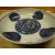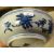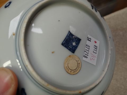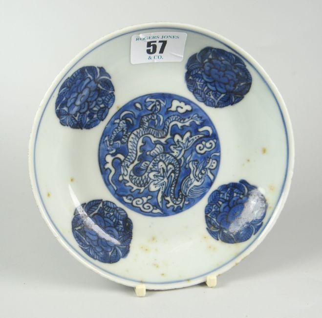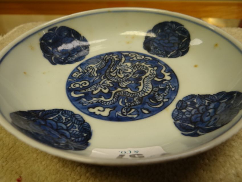 CHINESE PORCELAIN BLUE & WHITE SHALLOW DISH depicting three clawed dragon within clouds, decoration continuing to exterior with blue character mark to base & old label S Marchant & Son, 14.5cms diam