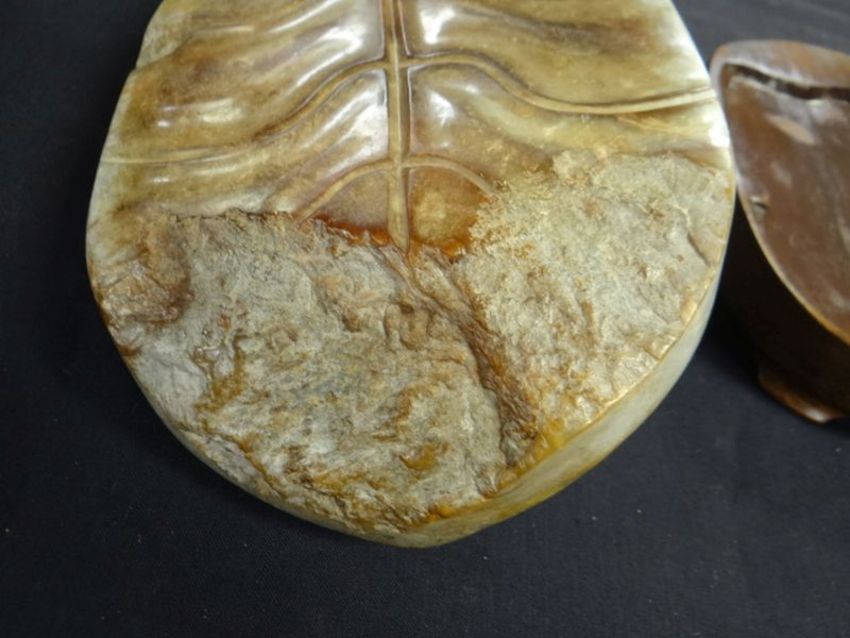 SPECIMEN HARDSTONE TURTLE SHELL ON HARDWOOD BASE the shell with incised scale-like decoration, 21cms long