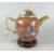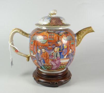 CHINESE PORCELAIN MANDARIN TEAPOT & COVER depicting figures & pagodas with alternating bird panels, the spout & handle in gilt finish, unmarked on hardwood stand, possibly associated, 19.5cms high overall