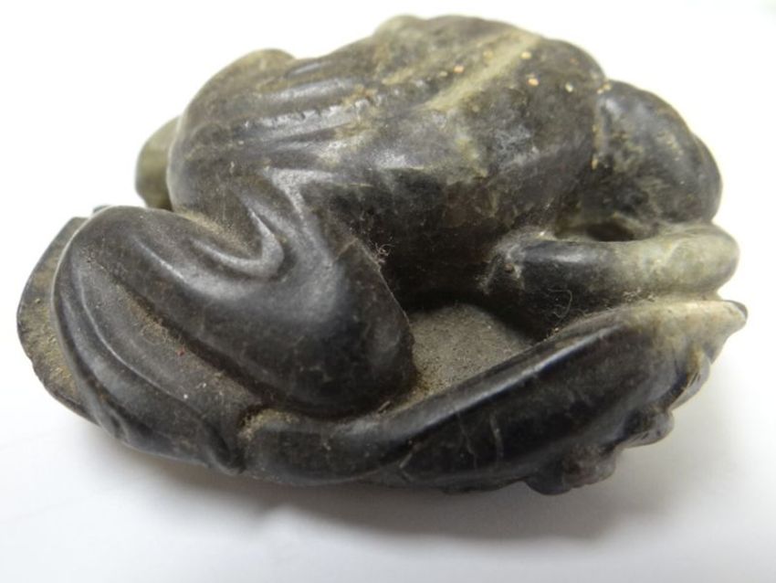 BELIEVED CHINESE CARVED BLACK & WHITE JADE STUDY OF A FROG ON LOTUS LEAF raised on hardwood base, 4.5cms high