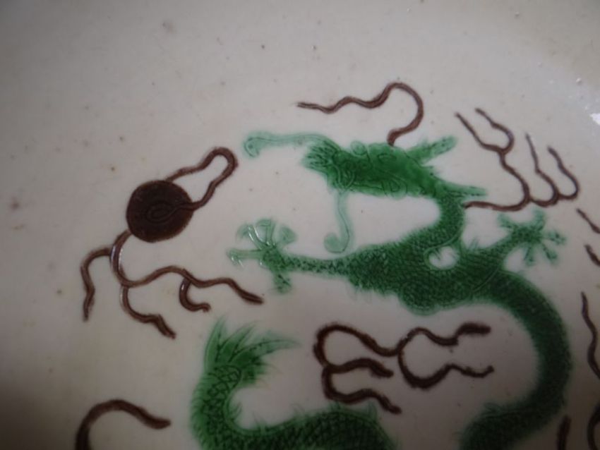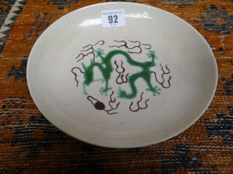 CHINESE PORCELAIN SHALLOW DISH RAISED ON CIRCULAR FOOT decorated with green five clawed dragon chasing flaming pearl, six blue character mark to base, 18.5cms diam