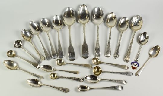 PARCEL OF ASSORTED SILVER SPOONS, to include picture back spoons, mustard spoon, flash engraved, enamel spoon engraved "S. S. R. C. Monthly Spoon Competition June 1908 Class II" etc. 11 troy Oz. approx.(23)