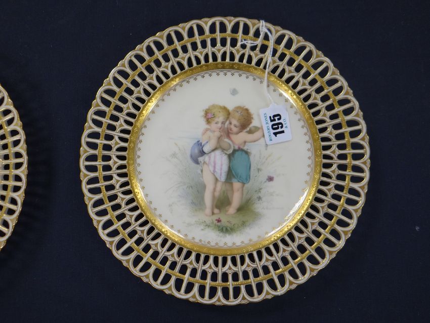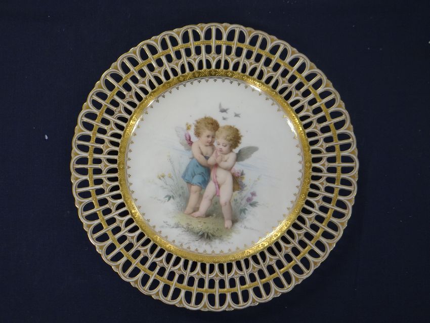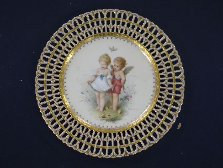 A SET OF FIVE MINTON CABINET PLATES EACH DECORATED BY ANTONIN BOULLEMIER with two playful cherub companions in various poses amongst wildlife, each signed, retail marks for Phillips & Pearce of New Bond Street, 24cms diamcondition:Good overall condition, no obvious or major damage, cracks or restoration. Some very minor frits to base rims. Possibly very minor nicks to piercing, nothing significant. No evidence of significant crazing.