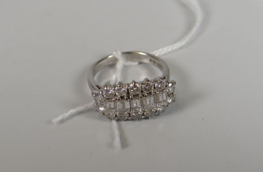 18CT WHITE GOLD DIAMOND CLUSTER RING made up of five central baguette diamonds and fourteen surrounding diamonds. 5.8 grams, comes in box.