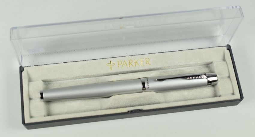 MODERN BRUSHED STEEL PARKER IM ROLLERBALL PEN with chrome trim, in Parker box