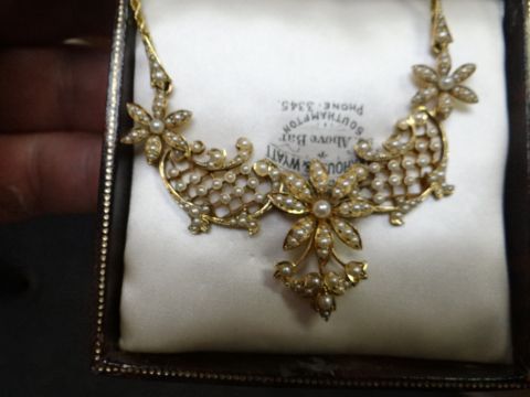 15CT YELLOW GOLD SEED PEARL PENDANT ON CHAIN, the five section pendant of floral and foliate design in Parkhouse & Wyatt Goldsmiths of Southampton box. 16.2 grams, 43 cm long.