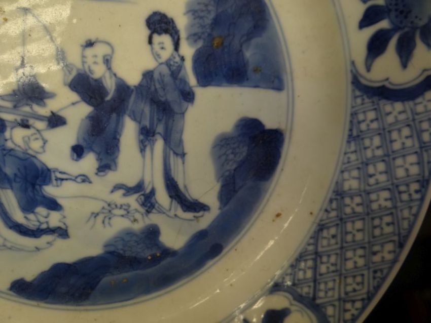 TWO SIMILAR CHINESE PORCELAIN BLUE & WHITE SHALLOW DISHES depicting two females with incense burner & the other depicting figures & crab, both within floral & geometric borders, both having six character marks to base, both 20.5cms diam approx. (2)
