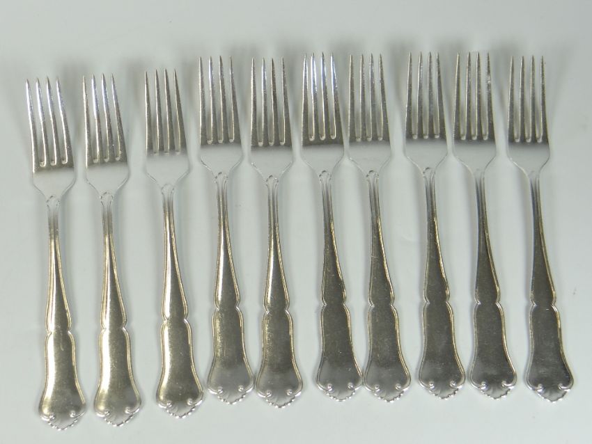 SET OF TEN NORWEGIAN SILVER FORKS of shell and scroll design. Hallmarked "830 S" and further mark "NM" possibly for Brodrene Mylius, 11.5 troy Oz. approx. (10)
