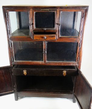 CHINESE CARVED HARDWOOD TABLE TOP DISPLAY CABINET having configuration of five glazed doors surrounding small central drawer above carved blind panelled cupboard revealing fitted interior drawer raised on stile-type feet, 55 x 37.5 x 20.5cms deep