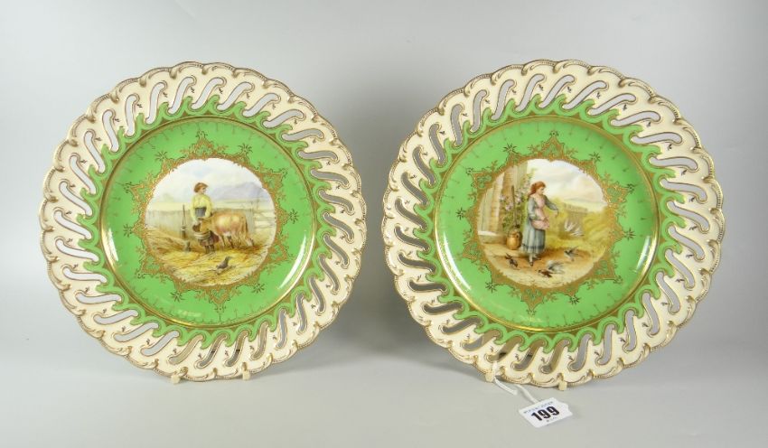A PAIR OF COALPORT CABINET PLATES PAINTED WITH FARM SCENES BY KEELING each of lobed form with scroll-pierced border, the centre scenes finely painted with a girl feeding birds in a courtyard entitled to the base 'Feeding Pigeons' and with a girl feeding a calf beside a fence entitled 'The Pet Calf', both signed within the scenes, Tiffany & Co New York retail stamp to bases, 25cms diamCondition: 1 x hairline on one plate from piercing to border. Structurally sound.