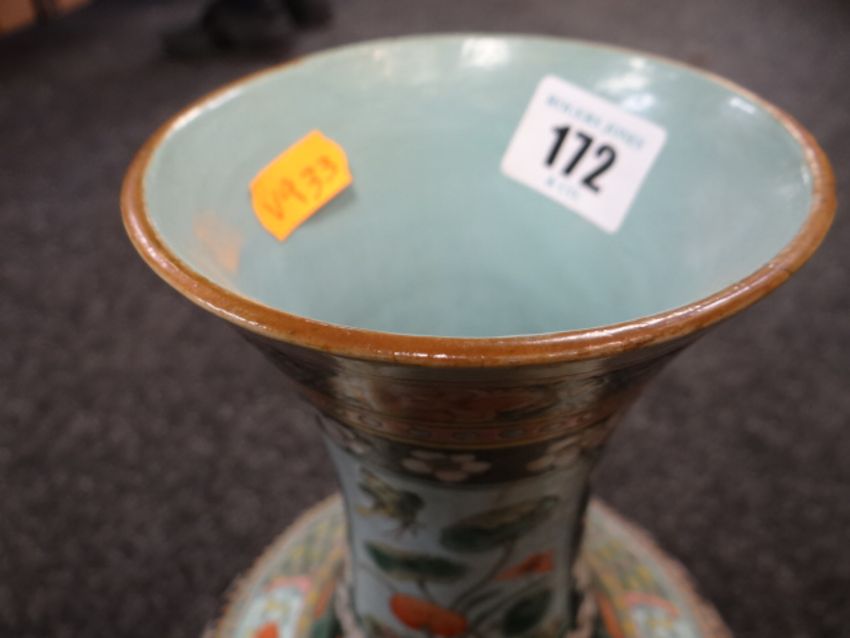 CHINESE PORCELAIN FAMILLE VERTE TURQUOISE GROUND ONION-SHAPED VASE decorated with fantastic bird panel within floral & geometric borders, unmarked, 38.5cms high