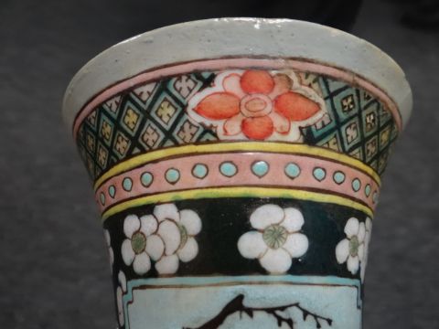 Condition Report: has been restored to the flared rim, body sounds a little dull to the touch, maybe further restoration, also crack from top rim down through fair section of the neck.