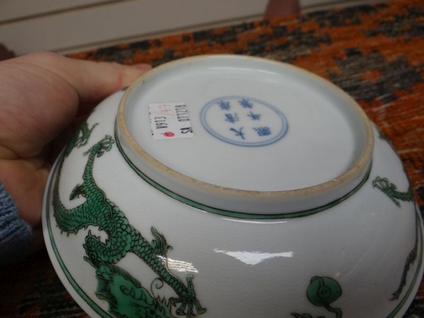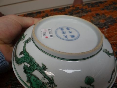 CHINESE PORCELAIN CIRCULAR SHALLOW DISH decorated with five clawed green dragon chasing flaming pearl, six blue character mark to base within double concentric circles, 17.5cms diam