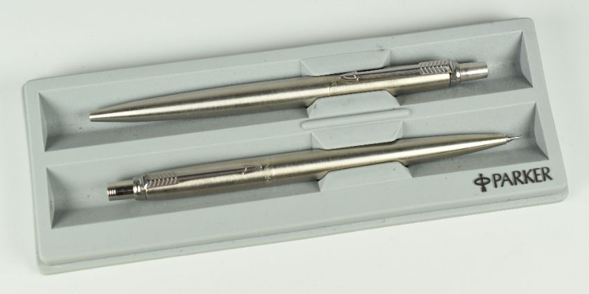 MODERN STAINLESS STEEL PARKER JOTTER FLIGHTER BALLPOINT PEN & PENCIL SET in original box