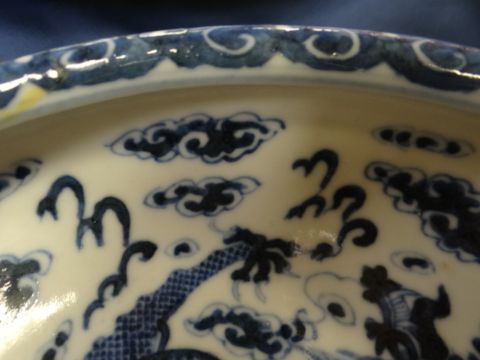 CHINESE PORCELAIN BLUE & WHITE BOWL depicting five claw dragon chasing a flaming pearl within clouds, four character mark to base (blue), 24cms diam