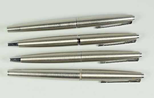 FOUR VINTAGE STAINLESS STEEL PARKER 45 FLIGHT FOUNTAIN PENS two with silver tail caps (late 60s / early 70s), two later models with no tail caps (late 70s / early 80s), all with chrome trim