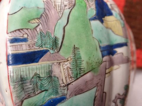 CHINESE PORCELAIN FAMILLE VERTE VASE depicting figures & trees within landscape with mountains in distance, unglazed & unmarked to base, 31.5cms high