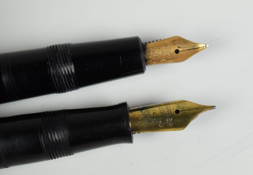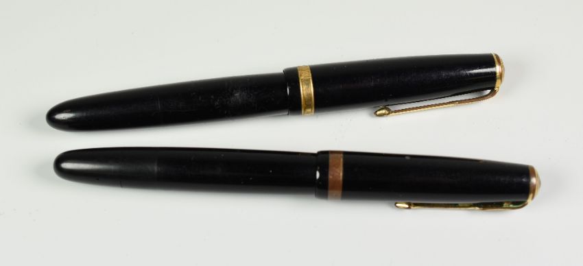 TWO VINTAGE BLACK PARKER DUOFOLD STANDARD FOUNTAIN PENS with 14ct gold nibs, one button fill, one converter