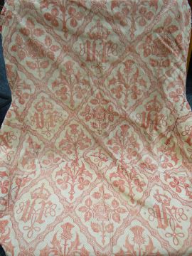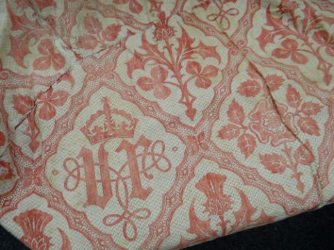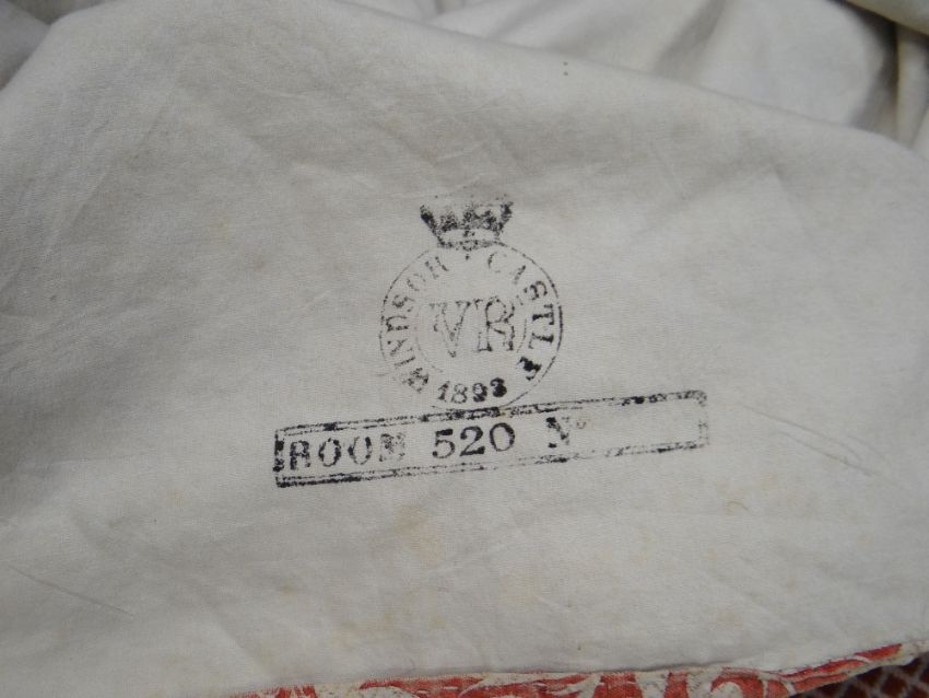 Provenance: letter to accompany reads ''...this is the chair cover of the tub chair used by Queen Victoria at Windsor. It came from her sitting room. Used regularly until her last illness. Given to my mother by the daughter of Mrs Davies, a palace servant of many years who was given it by his friend the housekeeper at Windsor Castle when the Queen's rooms were being refurbished by Edward VII and all the hangings and covers etc burnt in special incinerators. Mrs Davies asked her (as the sitting room curtains went by being carried by housemaids) if she could have a memento of the Queen. The housekeeper went inside and brought out the chair cover. 'That's from the Queen's chair' she said. Mrs Davies went on to St James's where she was chambermaid to the Prince of Wales eventually. The old Queen was very parsimonious and the chair covers had to be turned & patched until there was hardly any of the original left. This one has never been touched since it left her chair and there is still a faint odour of perfume perhaps from the pomade on her hair. Also a grease spot!! Joyce Williams, 29 Warren Road, Banstead, Surrey''
