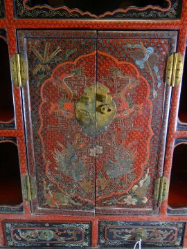 JAPANESE LACQUERED TABLE TOP CABINET having blind panelled central cupboard flanked by open shelves above two short drawers, raised on rectangular platform base, 76 x 51 x 24cms deep