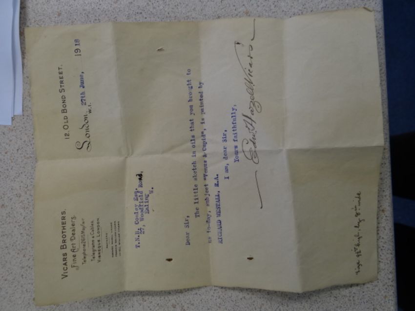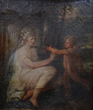 Provenance: 1918 dated letter to accompany the picture addressed to T N B Cowley of Ealing from Vicars Brothers, Fine Art Dealers of Mayfair and stating that the '...sketch in oils that you brought to us to-day, subject 'Venus & Cupid' is painted by Richard Westall RA'. Old labels applied verso with Mr Cowley's address.