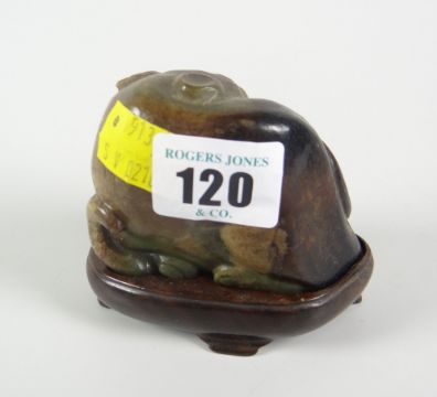 BELIEVED CHINESE SPINACH JADE STUDY OF ANIMAL GROUP consisting of adult & young, raised on hardwood base, 8cms high