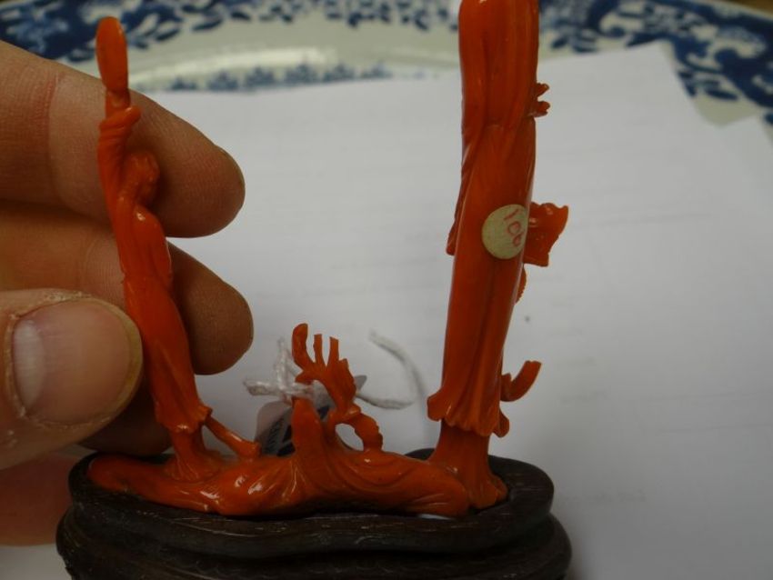 CARVED CORAL STUDY OF MOTHER & DAUGHTER HOLDING FANS ON HARDWOOD BASE together with another possible blue soapstone carved figure group on hardwood stand, both 12cms high approx. (2)