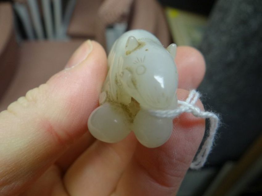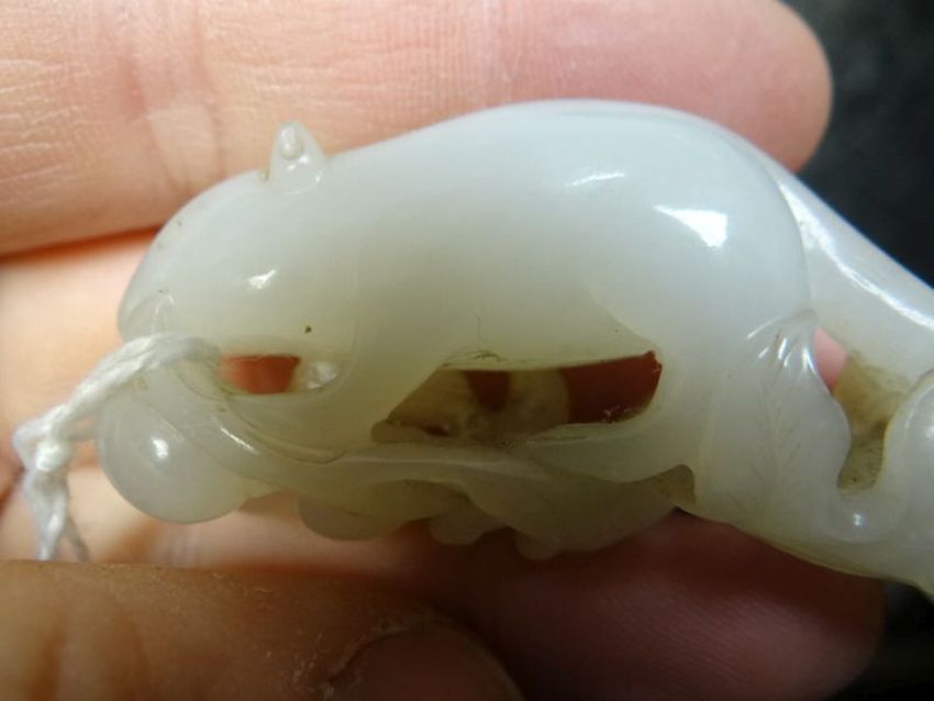 BELIEVED CHINESE JADE CARVED STUDY OF A RAT on naturalistic base raised on hardwood stand, 5cms high