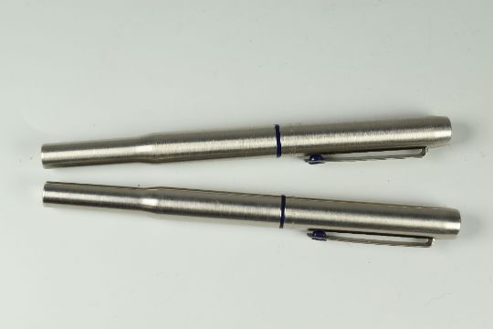 VINTAGE PRE 1980 STAINLESS STEEL PARKER 25 FOUNTAIN PEN together with a 1996 stainless steel Parker 25 rollerball pen, both with blue trim