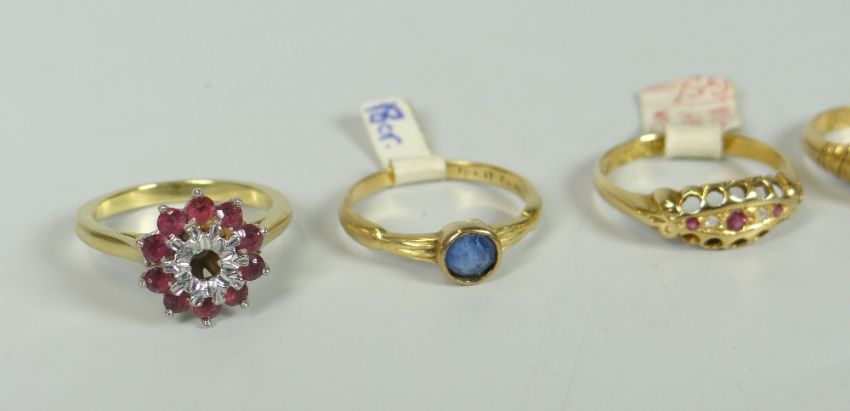 FIVE 18CT GOLD LADIES RINGS to include illusion set diamond, ruby flower head etc (5) 14.8 grams approx.